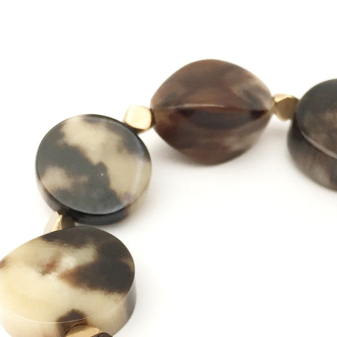 organisch geformte Zebu Horn kugeln und Scheiben auf einer Satin Kordel aufgezogen mit Sterling Siber und vergoldeten Ringen mit Verschluss.