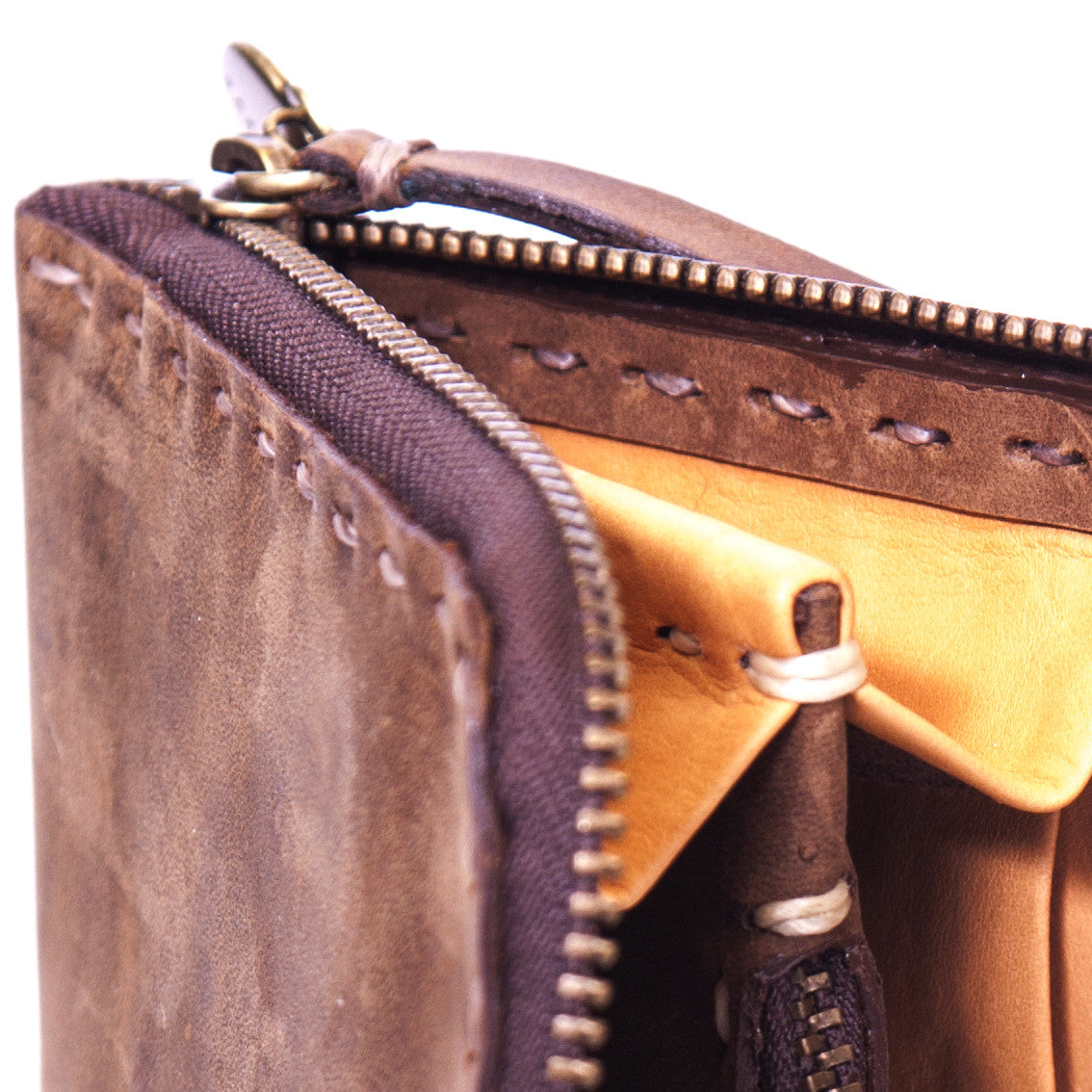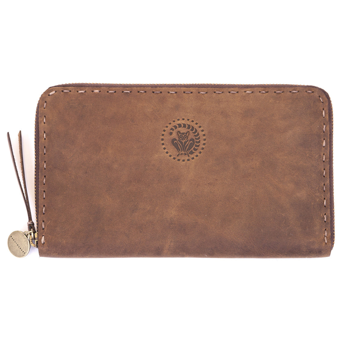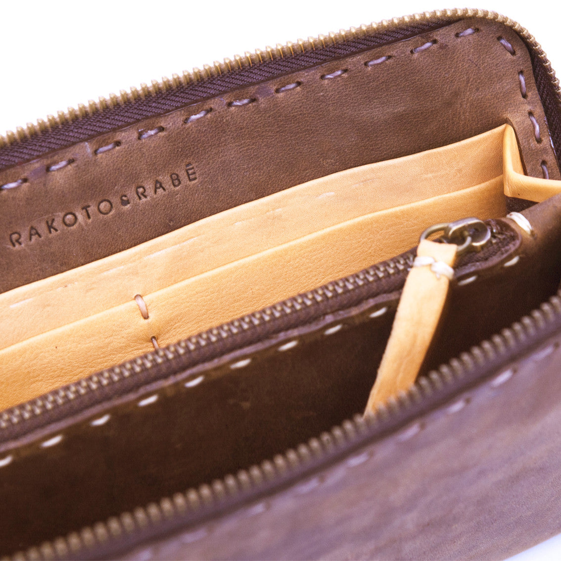 Geldbeutel für Damen und Herren Sombun aus samtweichem, dunkelbraunen italienischem Nubukleder. Die Brieftasche hat einen umlaufenden Reißverschluss und mehrere Innenfächer. Elegante Logoprägung und handgenähte Ziernaht auf der Außenseite der Börse. Ein edles Schmuckstück für jeden Tag.