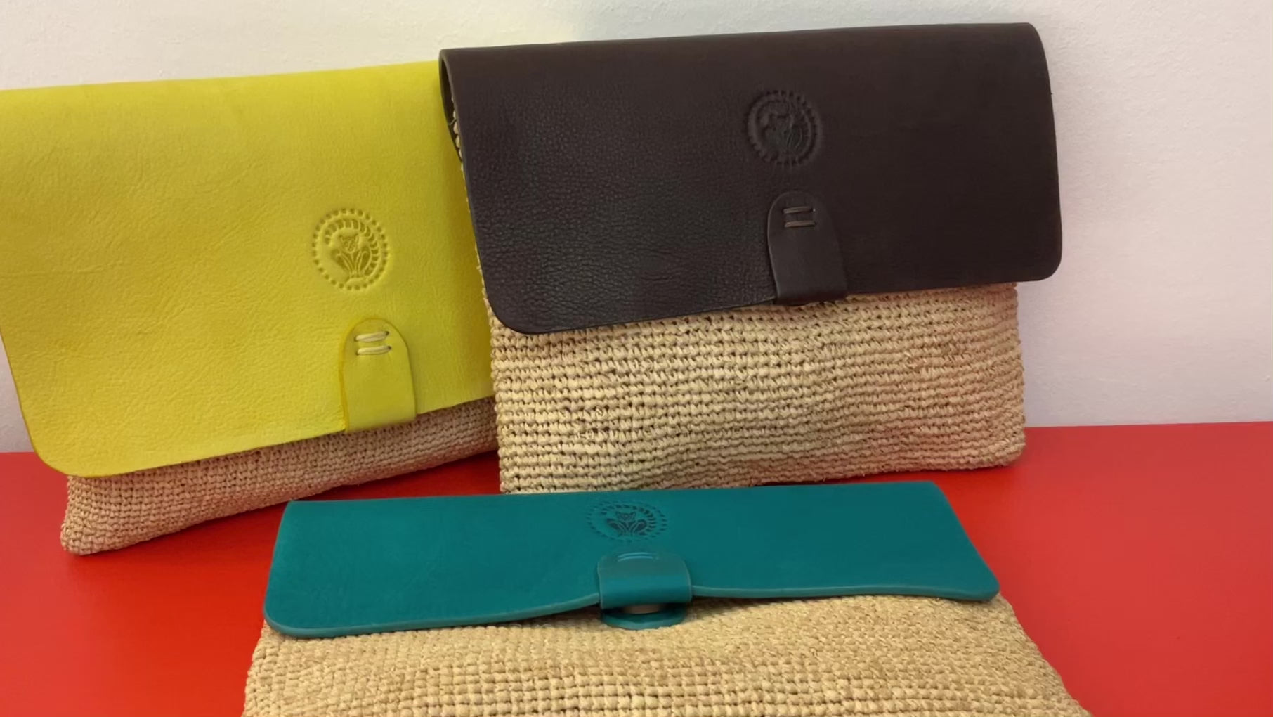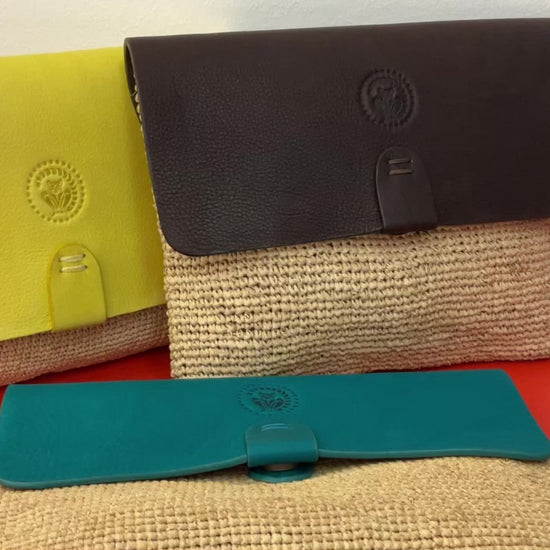 Raffia Clutch Tasche in Natur handgefertigt mit Leder. Verschließbar mit einem Magnetknopf.